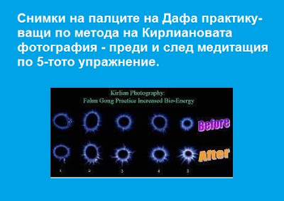 Направени са биоенергийните изображения на човешки палци преди и след медитацията по 5-тия комплекс упражнения на Фалун Дафа. Заснемането е направено по фотоелектричната технология на Kirlian CV6000, използвайки камерата Sony DCR-VX2000 NTSC.